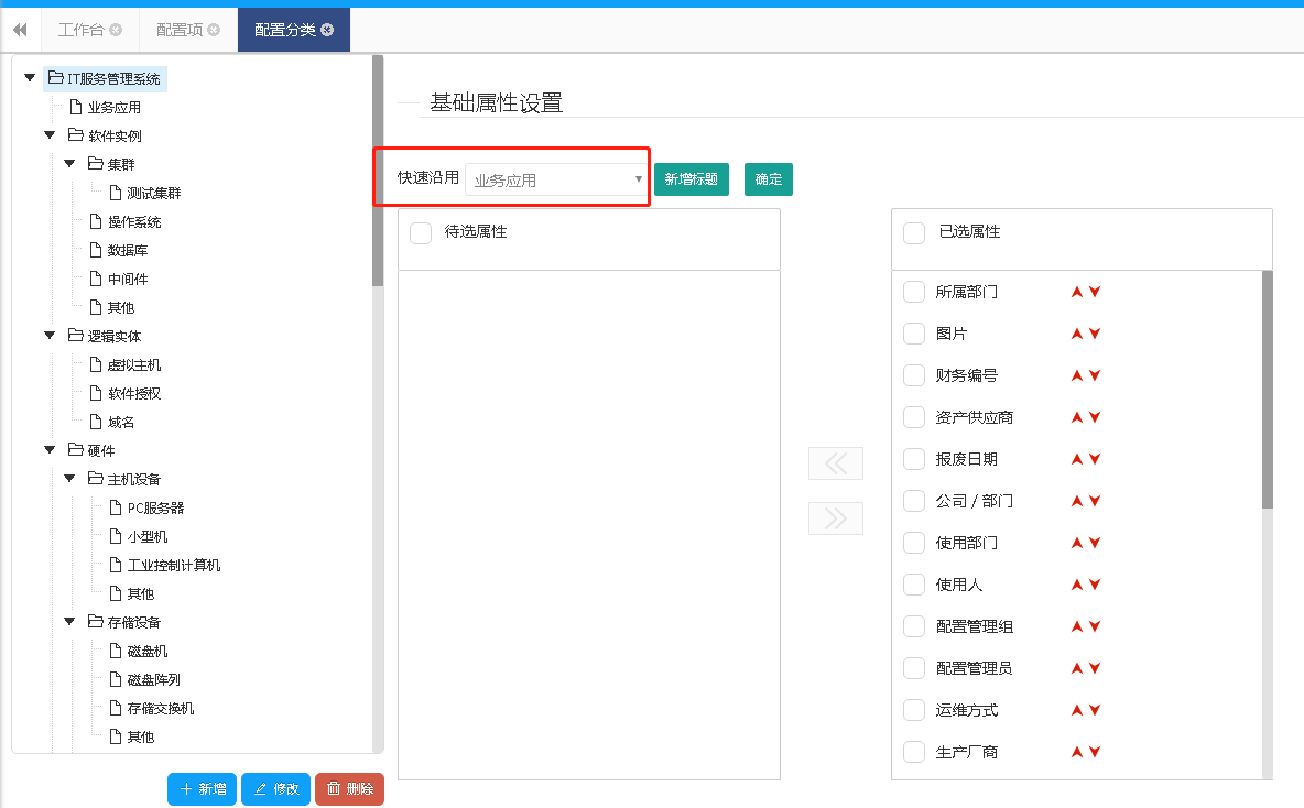 配置方法:1)点击资产分类后会出现待选属性,选中属性后可以保存到已选属性里,在创建配置项时便可看到已选属性字段,进行填写。