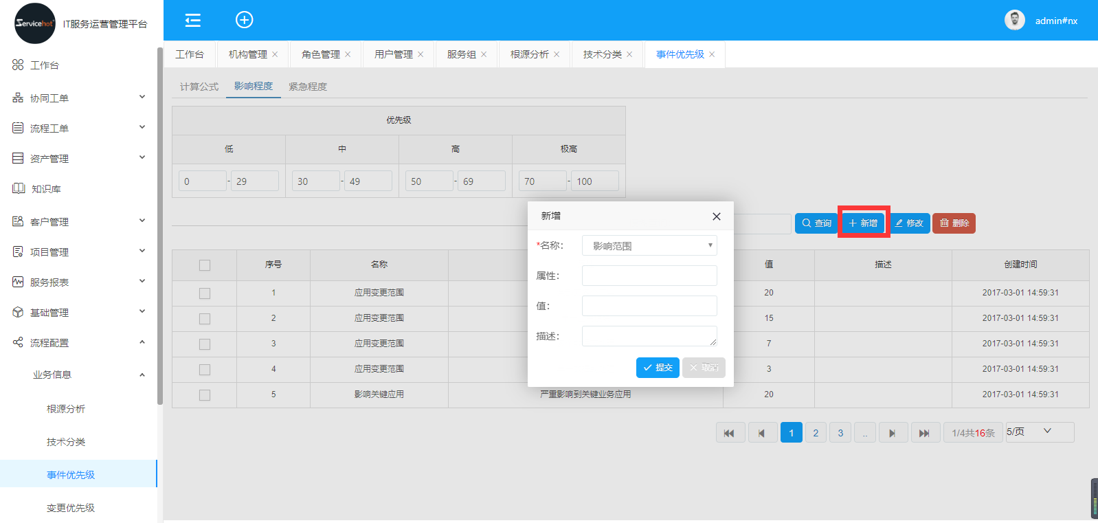 选择“影响程度”,点击“新增”按钮,填写新增的内容,点击提交;