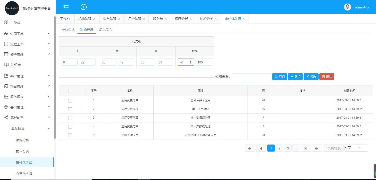 事件优先级通过影响程度、紧急程度两个维度自定义优先级。