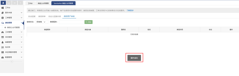 用系统管理员的账号登录ServiceHot ITSOM服务管理系统,点击微信公众号管理页面的微信渠道【管理】按钮,打开ServiceHot微信公众号管页面,点击微信用户审核这一栏,可以看到待审核的账户,点击操作中的【审核】按钮,即审核通过,审核通过的用户可以在微信端执行提交及查询工单的操作,相关步骤如下图