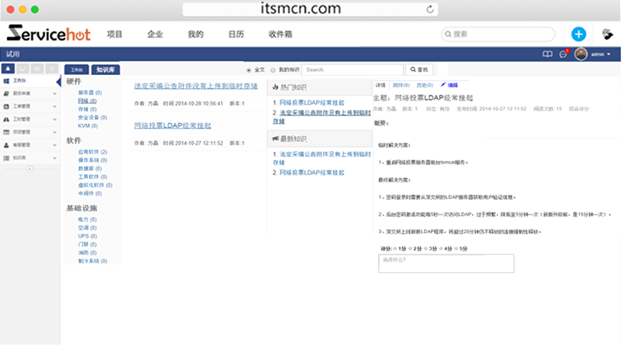 ServiceHot知识库是一个解决方案的汇总,针对各种IT应用和设备故障现象,知识库提供了系列行之有效的解决方案。知识库引入了国际通用的WIKI平台,除了知识库管理者可以维护知识库记录外,任何使用者都可以添加个人的评论,各种评论都可以作为版本的一部分保留于知识库中,通过使用者的评价和完善,后续使用者可以获得更加完美的解决方案。