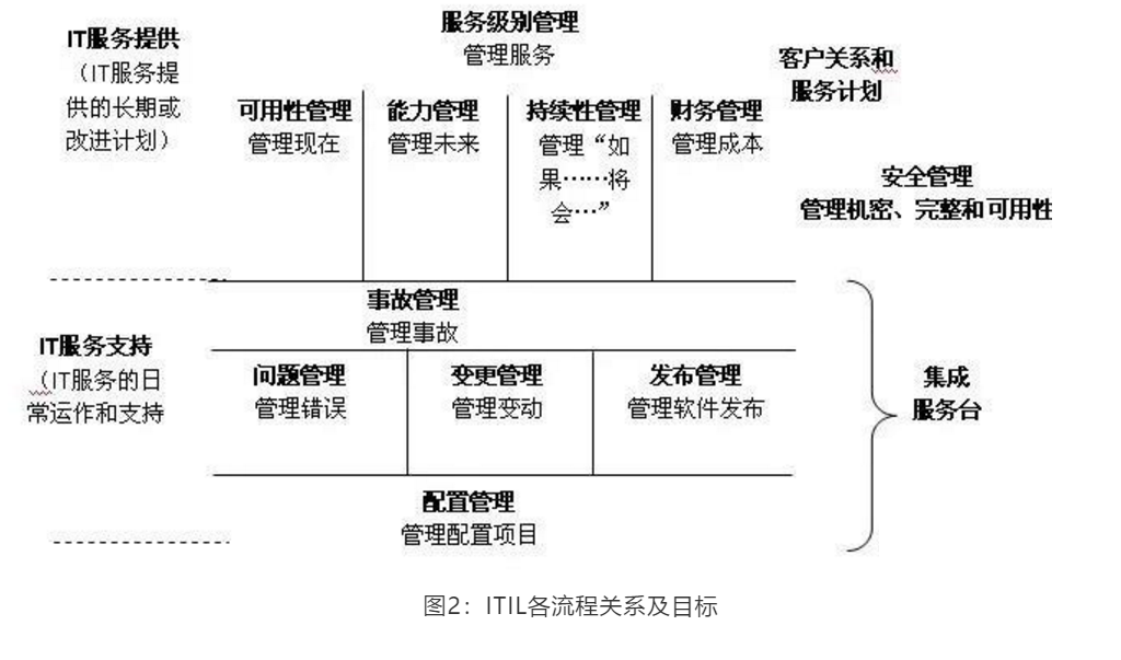 从国内外应用ITIL的成功案例来看,绝大部分企业只是应用了其中部门模块。不同的企业、不同的企业发展阶段,可能会有不同的需求,因此实施IT服务管理项目需要能够做到总体规划、分步实施,部分企业可以采取“小步快跑”的策略。ITIL对应的流程之间的关系以及流程作用如下图所示,不同的企业可以根据具体情况进行甄选。